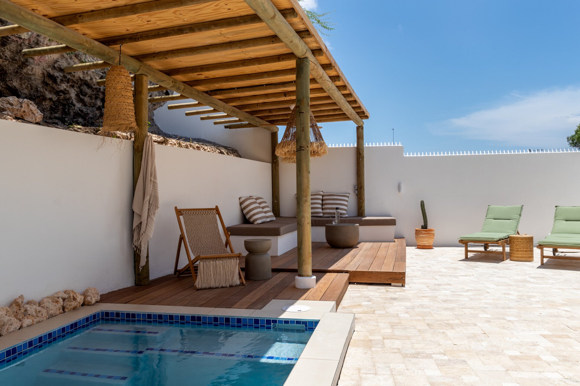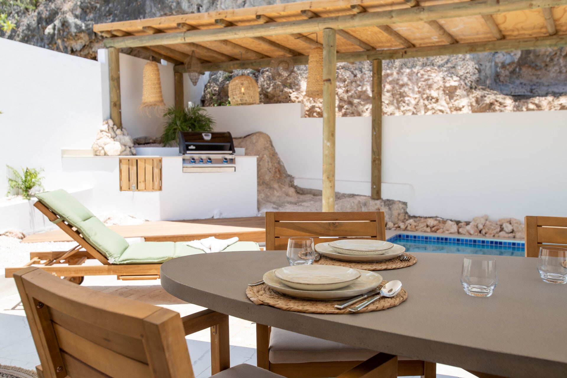 De villa biedt een ruime living (met airco), 3 slaapkamers, elk met een eigen badkamer, en beschikt over een privé zwembad en BBQ-hoek.